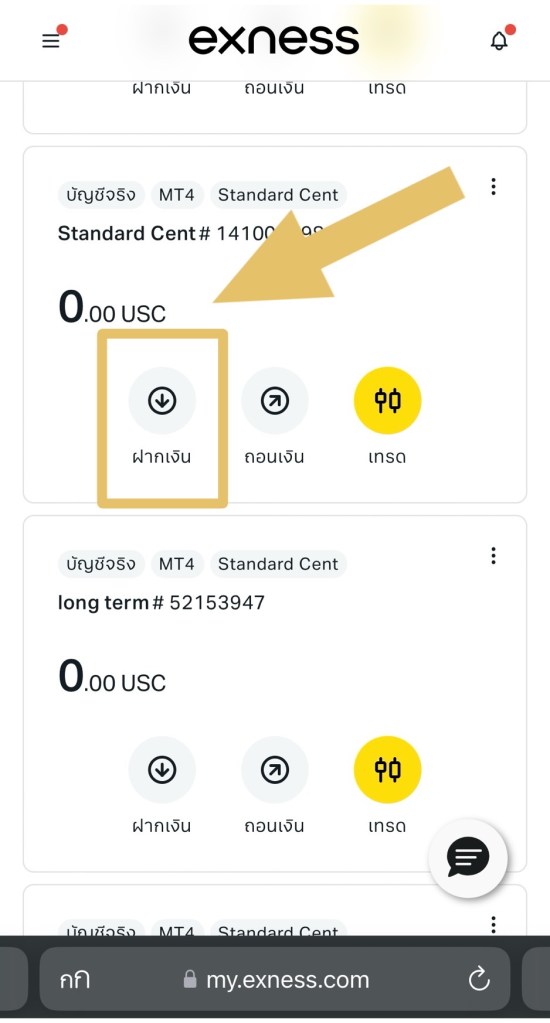 2.เลือกบัญชีเทรดที่ต้องการจะฝากเงินเข้า แล้วคลิ๊ก “ฝากเงิน”