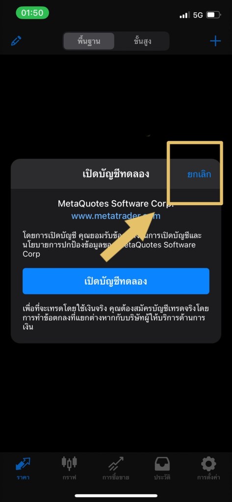 6.เมือติดตั้ง MT 4 เสร็จแล้วระบบจะให้เปิดบัญชีทดลองให้เรา คลิ๊ก “ยกเลิก”