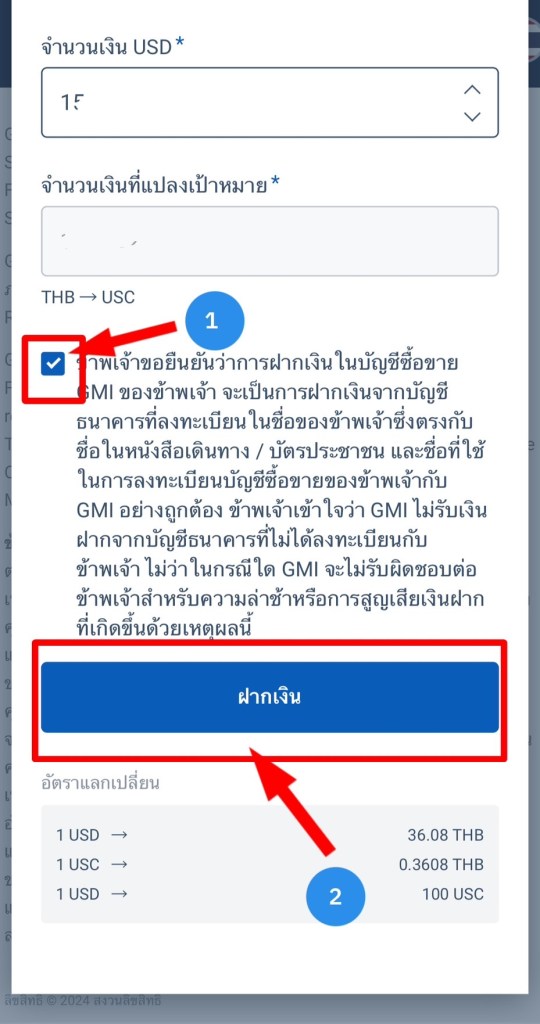 6. ติ๊กถูกในช่องสี่เหลี่ยม และคลิ๊กที่ “ฝากเงิน”