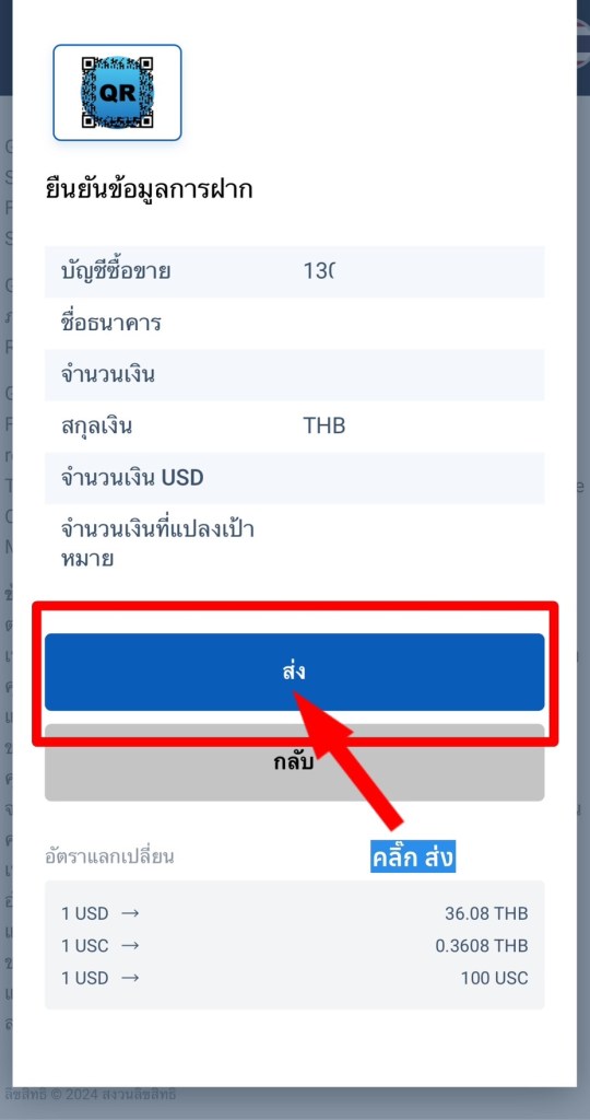 7.ตรวจสอบข้อมูลการฝากเงิน หากถูกต้องแล้ว คลิ๊กที่ “ส่ง”